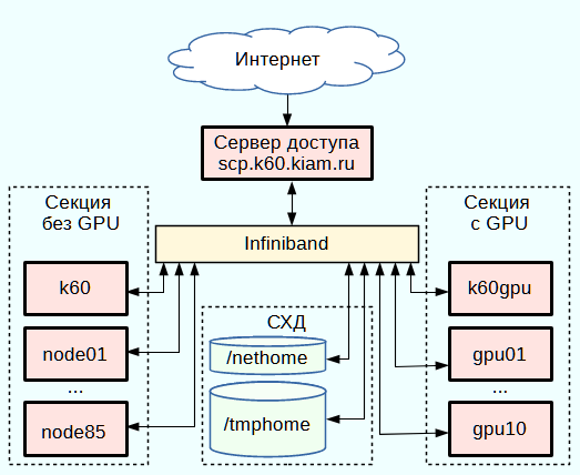 - Cервер удалённого копирования scp.k60.kiam.ru, общий для обеих секций.
